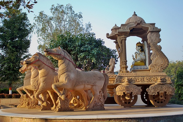 Surya, the Hindu god of the Sun also has a chariot with seven white horses (representing the seven days of the week. It may not seem like it but the sun is out every day.) The sun salutation pose in yoga comes from worship of Surya. My back isn’t supple enough to do the bends, but I can do the upward salute with the arms. Surya carries symbols of solar energy – a wheel, conch shell, and lotus. In Buddhism, conch shells that are right-spiraling signify the celestial motion of the sun and planets across our heavens. In Egyptology the lotus, emerging from the water each day to bloom anew, symbolizes the sun and creation. The wheel – ah! a most ancient solar symbol.